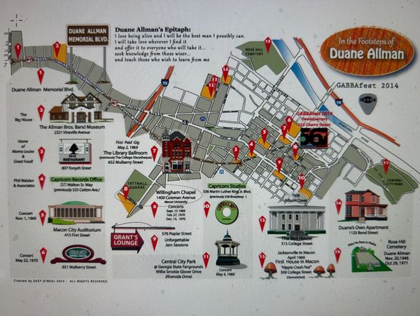 There are numerous Duane Allman and Allman Brothers Band historic sites in Macon. This home has a walk score of 67/100 and is walkable to many of them. Rose Hill Cemetery is 0.3mi, and the Bell House and the Hippie Crash Pad are 0.2 miles away. Downtown Macon is an easy walk through Coleman Hill Park, a park with panoramic city views that is literally right down the street. Eat at H&H Soul Food where the band ate during recording sessions at Capricorn Records. Visit the Big House Museum where Duane and the band later lived communal style.